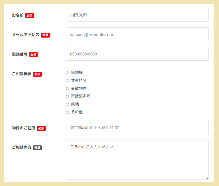 入力内容は、名前、メールアドレス、電話番号で自分の住所は不要。
